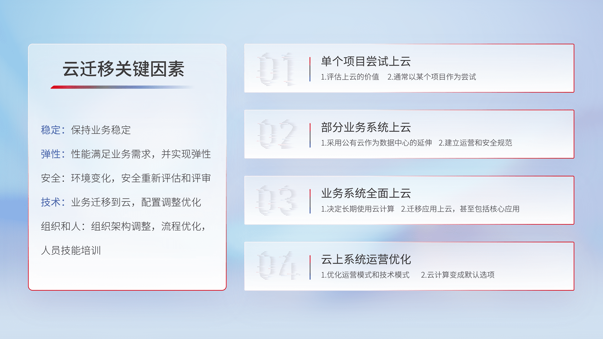 结合实际业务,,从规划设计、、、云平台选型、、、云原生改造、、、、数据迁移、、、集成交付,,迁移全过程为客户识别最佳上云路径,,,做好风险识别管理,,设计网络架构、、身份权限、、、、安全审计合规、、、操作审计、、、、日志审计、、监控告警策略、、、、多站点容灾设计等,,,对云上基础设施进行整体规划,,,提升IT治理水平,,以满足弹性、、高可用、、、高性能的需求。。。。